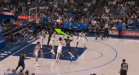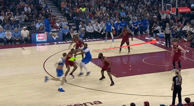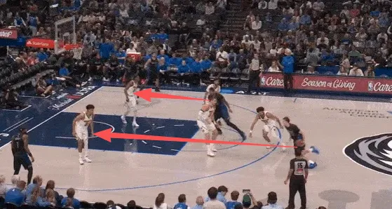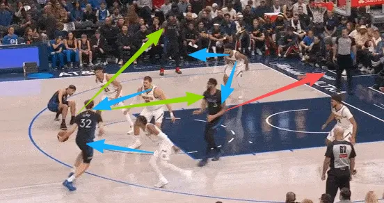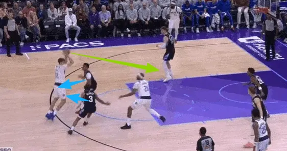 挡拆行进间吸引到双人夹击的瞬间、赶在乔治换防到顺下加福德前,立即跳传找到顺下的加福德。